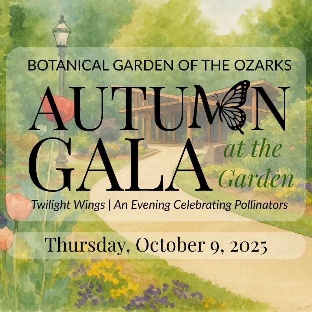 Join us for a memorable evening under the stars in support of the Botanical Garden of the Ozarks! This year’s Autumn Gala: Twilight Wings is a seasonal celebration highlighting BGO’s commitment to environmental awareness and education. Guests will enjoy live music, a delicious buffet dinner, fine beer and wine, and a curated silent auction — all set against the breathtaking backdrop of the Garden at dusk.